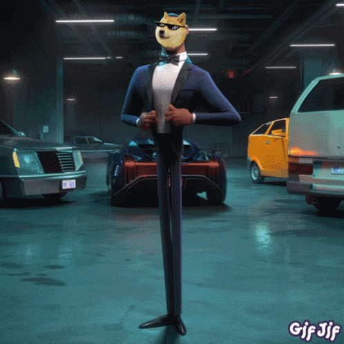 Opis sadržaja: a doge in a tuxedo is standing in a garage with cars