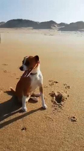 Opis sadržaja: a brown and white dog is sitting on the beach looking at the camera .