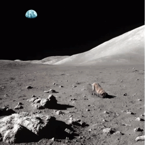 Opis sadržaja: a dog is standing on the moon with the earth in the background