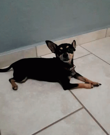 Opis sadržaja: a small black and brown dog is laying on a tile floor .