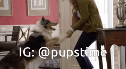 Opis sadržaja: a woman is playing with a dog in a living room with the hashtag @pupstime on the bottom