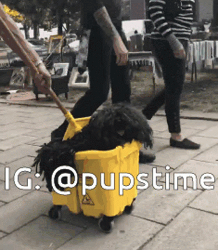 Opis sadržaja: a person pushing a black dog in a yellow bucket