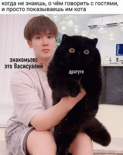 Opis sadržaja: a man is holding a black cat in his arms with a caption in russian