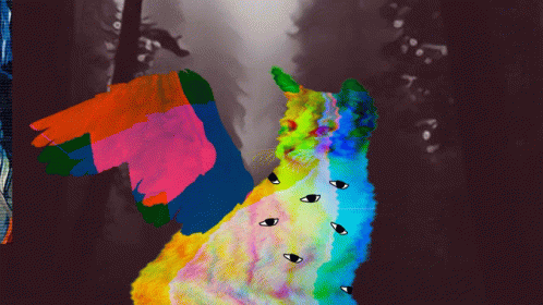 Opis sadržaja: a painting of a rainbow colored cat with many eyes