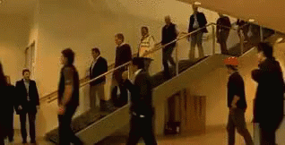 Opis sadržaja: a group of people walking down stairs in a building