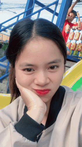Opis sadržaja: a woman taking a selfie in front of a sign that says 100 lux