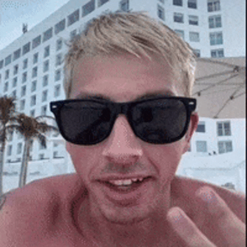 Opis sadržaja: a shirtless man wearing sunglasses is smiling and waving at the camera