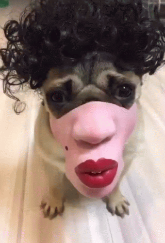 Opis sadržaja: a pug wearing a pink face mask with red lips