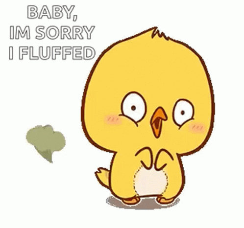 Opis sadržaja: a cartoon chicken is saying `` baby , im sorry i fluffed '' while holding a leaf .