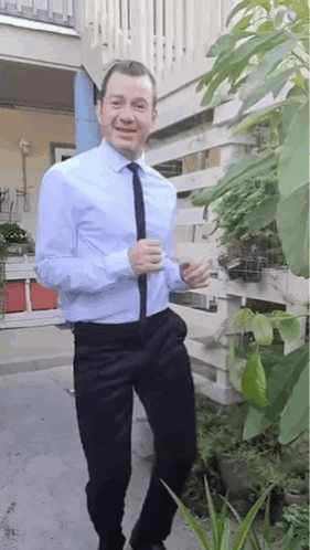 Opis sadržaja: a man in a blue shirt and tie is standing in front of a plant