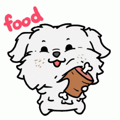 Opis sadržaja: a cartoon of a dog holding a piece of meat and the word food above it