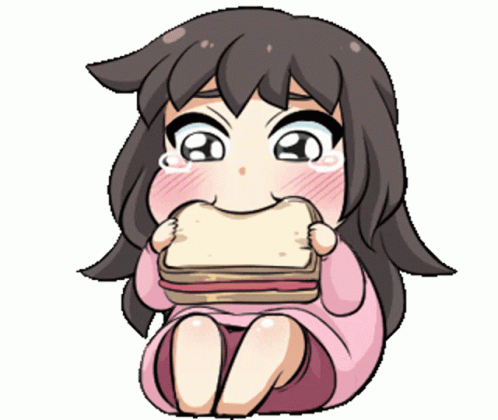 Opis sadržaja: a cartoon of a girl eating a sandwich with tears running down her face