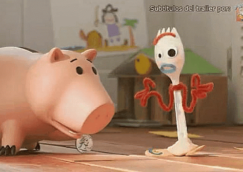 Opis sadržaja: a pig and a fork are standing next to each other in a room .