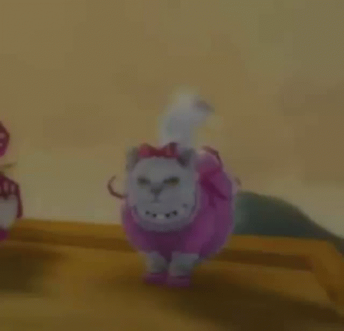 Opis sadržaja: a stuffed animal is standing on a table wearing a pink dress and a pink hat .