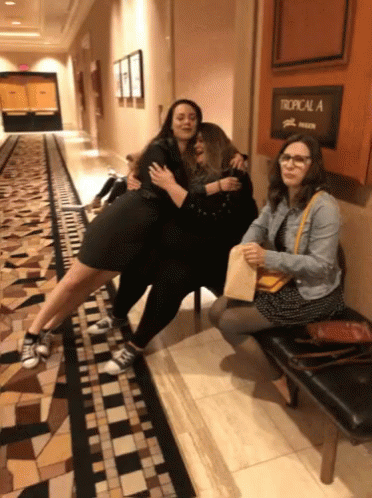 Opis sadržaja: three women hug in a hallway with a sign that says tropical a