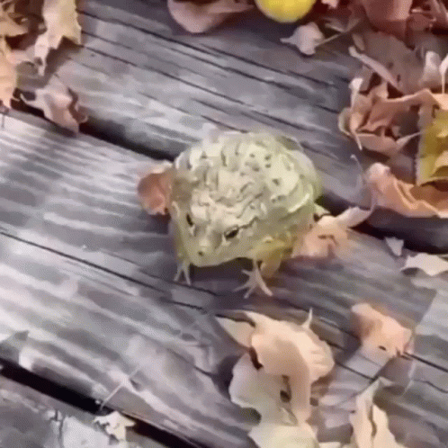 Opis sadržaja: a frog is sitting on a wooden deck with leaves .