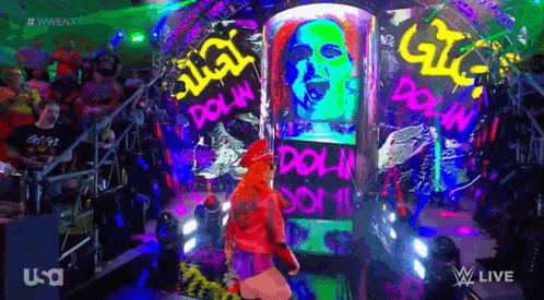 Opis sadržaja: a woman is standing in front of a glow in the dark sign that says glow in the dark