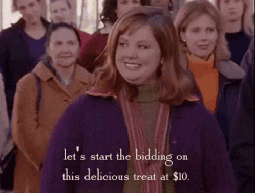 Opis sadržaja: a woman in a purple coat says let 's start the bidding on this delicious treat at $10