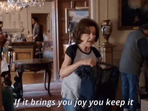Opis sadržaja: a woman is standing in a room holding a black bag and says if it brings you joy you keep it .