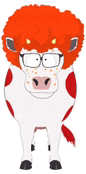 Opis sadržaja: a cartoon cow with glasses and a red afro is standing on a white background .