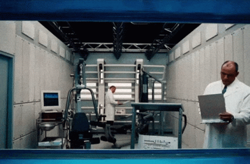 Opis sadržaja: a man in a lab coat is looking at a clipboard while another man works on a machine