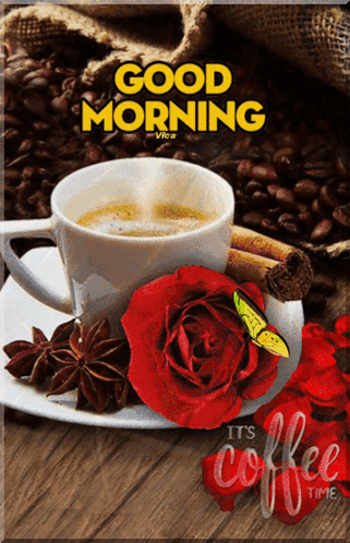 Opis sadržaja: a cup of coffee sits on a saucer next to a rose and a butterfly