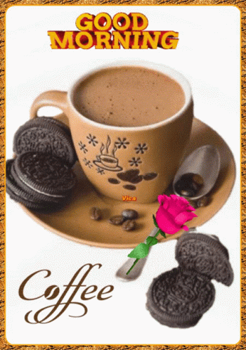 Opis sadržaja: a cup of coffee is on a saucer with oreos and a pink rose