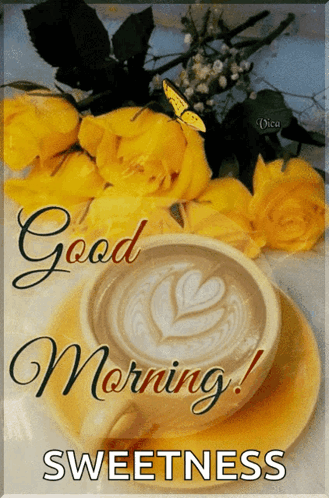Opis sadržaja: a cup of coffee on a saucer next to yellow roses and the words good morning sweetness