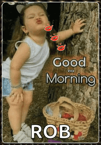 Opis sadržaja: a picture of a little girl kissing a tree with the words good morning rob on it