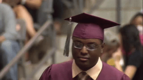 Opis sadržaja: a man in a purple graduation cap and gown stands in front of a crowd