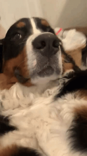 Opis sadržaja: a close up of a brown and white dog laying down
