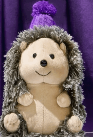 Opis sadržaja: a stuffed hedgehog wearing a purple hat is sitting in front of a purple curtain