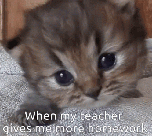 - Opis sadržaja: a kitten is sitting on a blanket with the words `` when my teacher gives me more homework '' written below it .