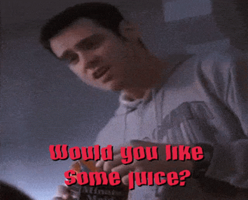 Opis sadržaja: a man in a grey sweatshirt says would you like some juice in red letters