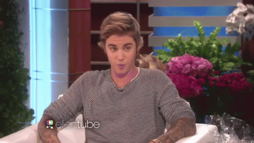 Opis sadržaja: justin bieber is sitting on a couch in front of flowers while wearing an ellentube shirt