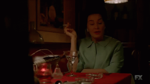 Opis sadržaja: a woman is sitting at a table with a martini and a cigarette and the fx logo is visible