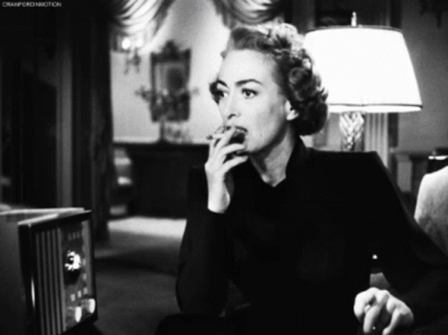 Opis sadržaja: a black and white photo of a woman smoking a cigarette with the caption " cramford motion " at the bottom