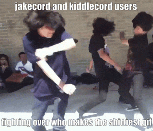 Opis sadržaja: a group of people dancing with the caption " jakecord and kiddrecord users fighting over who makes the shittiest gif