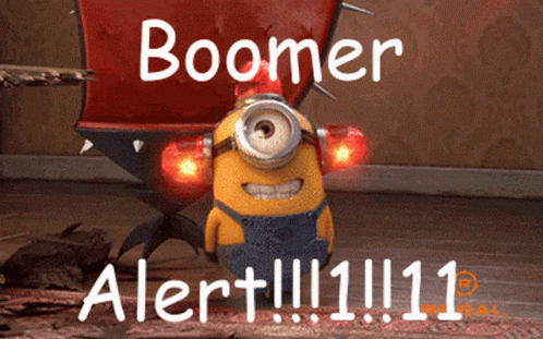Opis sadržaja: a picture of a minion with the words boomer alert on it