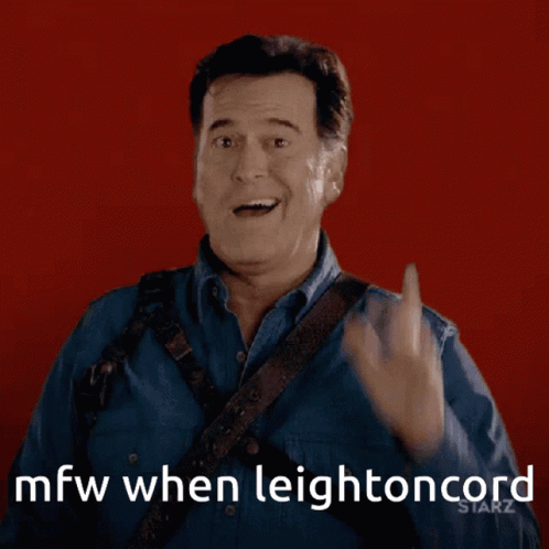 Opis sadržaja: a man is smiling and pointing at the camera with the words mfw when leightoncord written below him