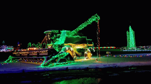 Opis sadržaja: a john deere combine harvester is decorated with green lights