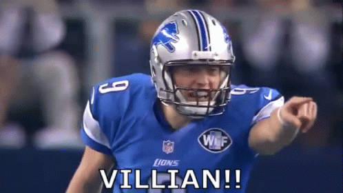 Opis sadržaja: a football player wearing a lions jersey is pointing at the camera and saying " villain "