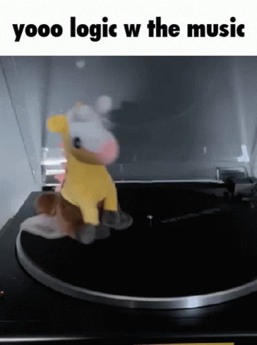 Opis sadržaja: a stuffed animal is sitting on a record player and the words yooo logic w the music are above it