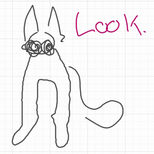 Opis sadržaja: a drawing of a cat with the word look written in red