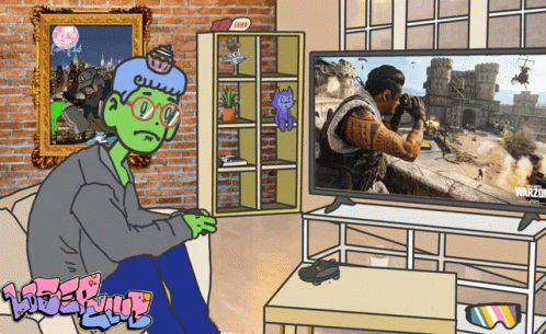 Opis sadržaja: a cartoon drawing of a man sitting on a couch playing a video game called warzone