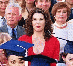 Opis sadržaja: a woman in a red sweater is standing in front of a crowd of people wearing graduation caps .