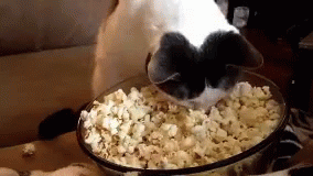 Opis sadržaja: a cat is eating popcorn from a bowl on a bed .
