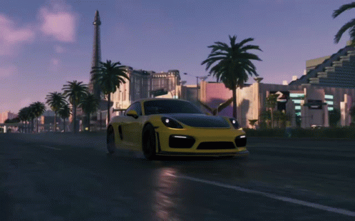 Opis sadržaja: a yellow sports car is driving down a wet road