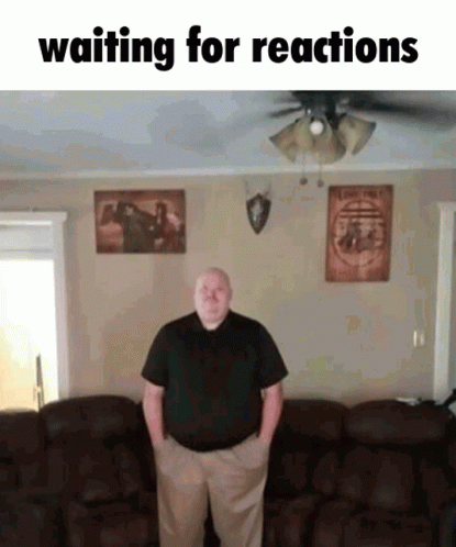 Opis sadržaja: a man is standing in front of a couch with his hands in his pockets and the caption waiting for reactions