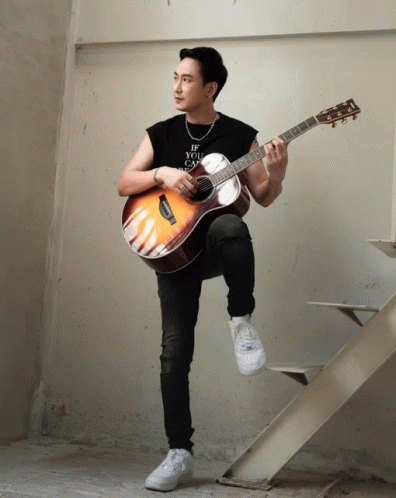 Opis sadržaja: a man holding a guitar and wearing a black shirt that says if i can dream